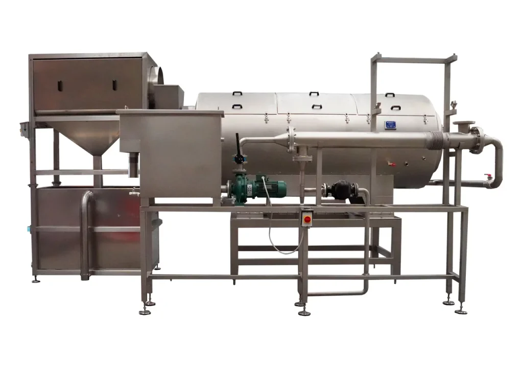 ZONA TRATTAMENTO DEI LEGUMI REIDRATATI Il deposito nelle vasche di ammollo per 8/12 h a seconda del tipo di legume ne permette la reidratazione. A completamento del ciclo, una tubazione forata posta al limite del bordo superiore, che pompa acqua dall’esterno sollevando il prodotto in deposito, ne facilita lo scarico. A reidratazione avvenuta, il prodotto con l’ausilio di una pompa e del canale ricezione legumi reidratati, viene spinto verso il separatore che elimina l’acqua mediante un sistema di riciclo. Il separatore è un cilindro rotante costituito da una lamiera forata contenente un elemento elicoidale che permette al prodotto reidratato di avanzare fi no ad arrivare al blancher dove ha inizio la fase di cottura. Terminata la fase di cottura, i legumi vengono convogliati verso un’ulteriore zona di cernita in cui uno spietratore consente l’eliminazione di residui di natura calcarea come pietrisco etc., che per gravità si adagiano sul fondo arrestando il proprio moto trattenuti dalle alette della grata. Il passaggio attraverso lo shaker permette la separazione dall’acqua residua e la granulazione di eventuali grumi di legumi. Un primo elevatore trasferisce il prodotto al serbatoio di accumulo che garantisce il regolare andamento della linea, qualora, a monte, si verifichi un breve fermo (max 5÷8 min). Estratto dal serbatoio mediante un piano vibrante, il prodotto viene elevato per la seconda volta e consegnato al vibrovaglio che lo distende in modo che la soffi ante collocata a valle del vibrovaglio possa allontanare i gusci. Il passaggio nella soffi ante termina su di una selezionatrice ottica per l’ulteriore vagliatura e il convogliamento nel canale vibrante dove tramite nastri trasportatori viene inviato al riempimento.