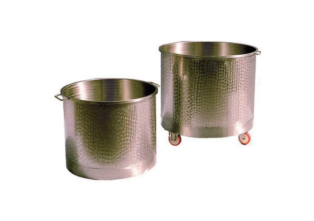 Tino di coagulazione per il processo di lavorazione latte. Tipo di cottura a parete semplice del tipo cilindrico verticale, su tre ruote di cui due fisse ed una piroettante o su fascia d’appoggio. Munito di: – Crociera di rinforzo sul fondo in acciaio inox; – Parete in lamiera d’acciaio inox aisi 304 satinata esternamente ed internamente – Saldature eseguite a regola d’arte, battute, molate, arrotondate, levigate, idonee ad uso sanitario alimentare; Bordo superiore in tubolare d’acciaio inox AISI 304 spazzolato e satinato La macchina è stata progettata e costruita con le norme UNI e CEI dal punto di vista meccanico ed elettrico ed è conforme ai requisiti essenziali di sicurezza previsti dalla Direttiva Comunitaria 89/392CE e successive integrazioni (91/368/CE).